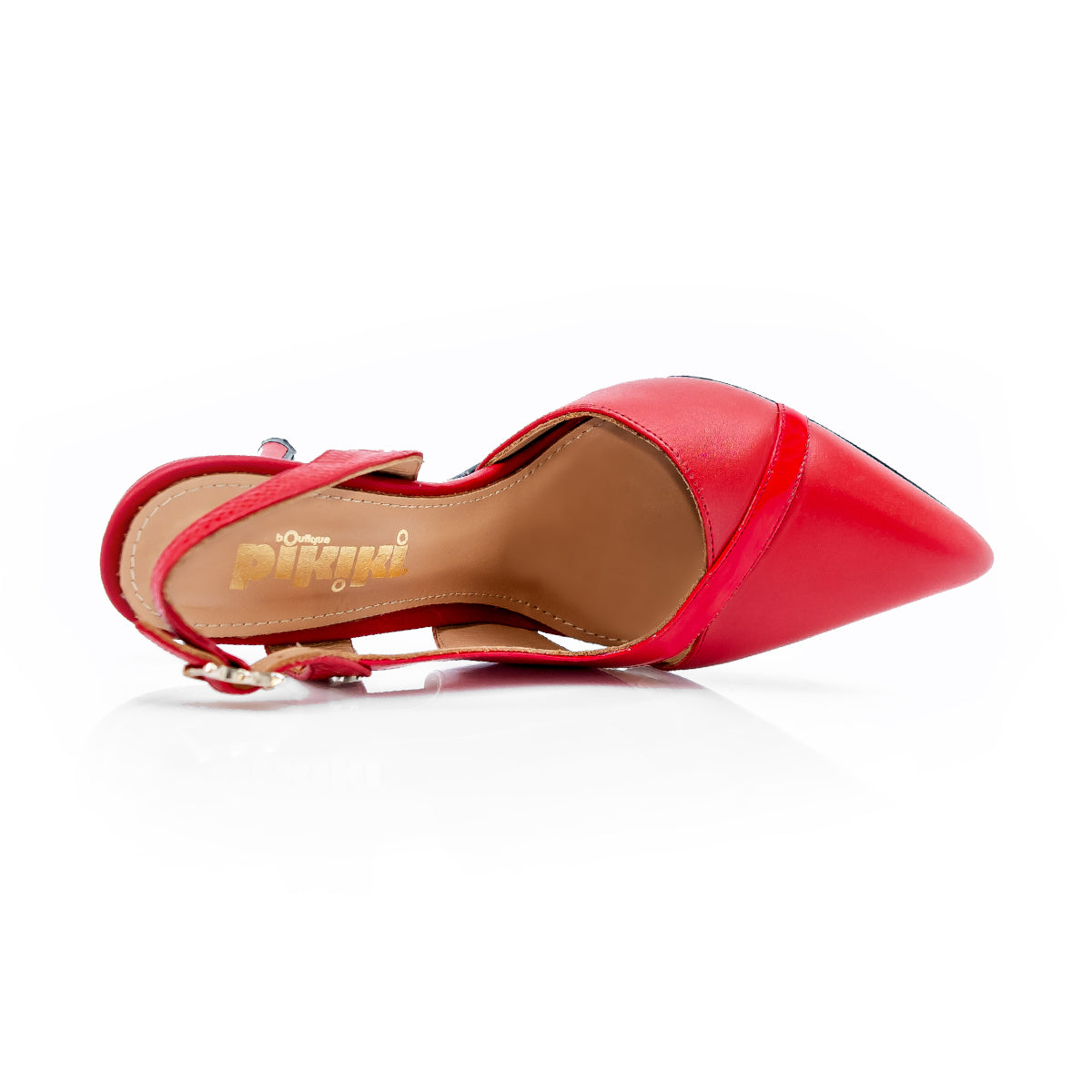 Zapatilla color rojo condiferentes texturasen pieles vacunas en estilo destalonado.